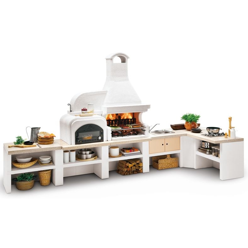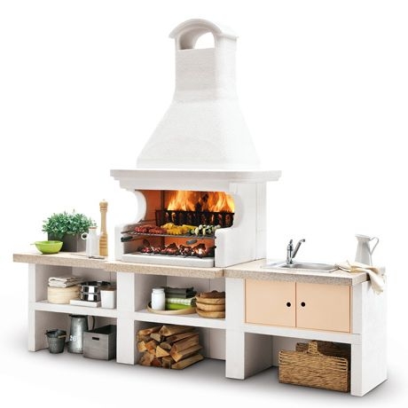 Выполнена из совместимых модулей. Столешница из полированного камня Marmotech. Основания всех модулей имеют заднюю стенку. Стальная решетка для дров и решетка из нержавеющей стали 76х40 см, с бакелитовыми ручками. Общие размеры: 450х85х218 см.