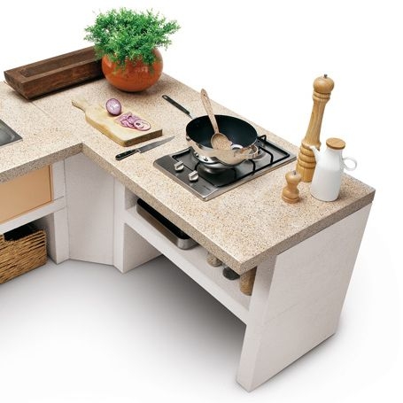 Выполнена из совместимых модулей. Столешница из полированного камня Marmotech. Основания всех модулей имеют заднюю стенку. Стальная решетка для дров и решетка из нержавеющей стали 76х40 с бакелитовыми ручками. Общие размеры: 450х85х218 см.