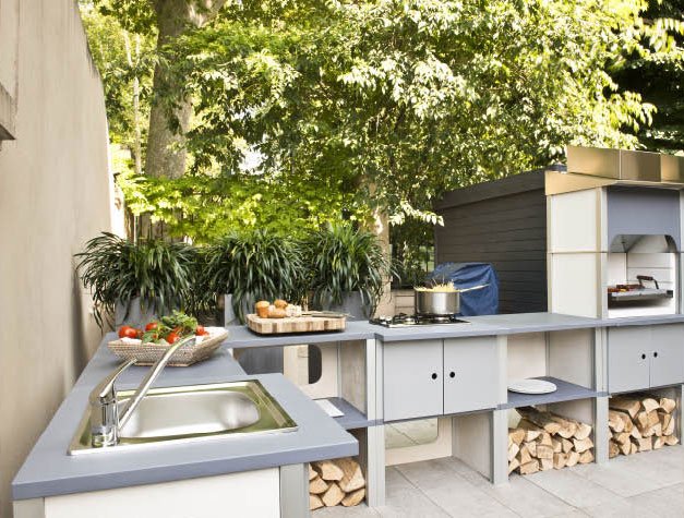 Программа St. Vincent специально разработана для садового расположения. Выполнена из совместимых модулей. Не требует укладочных и штукатурных работ. Легко разбирается и дополняется новыми модулями. Сделана из материалов, устойчивых к погодным изменениям. Духовка и раковина из нержавейки премиум-класса. Модуль гриль с топочной камерой из бетона и решеткой из нержавеющей стали 60х40 см.