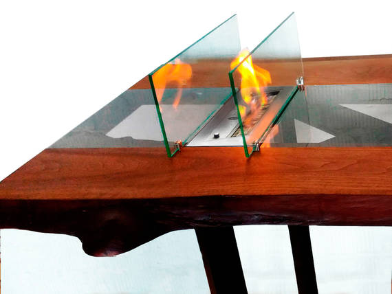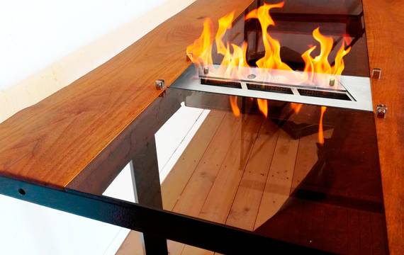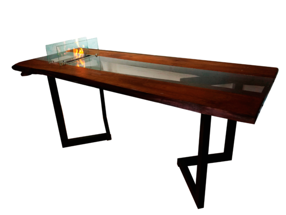Обеденный стол Mirage украшает иллюзия водной глади. Столешницу из слэбов ореха дополняет продольная вставка из тонированного стекла. Блики живого огня отражаются в ней, как в реке или в старинном зеркале. Биокамин установлен в торце стола и огражден прозрачными стеклами. Модное сочетание материалов рождает причудливую игру света и тени, помогает расслабиться и отвлечься от повседневных забот.