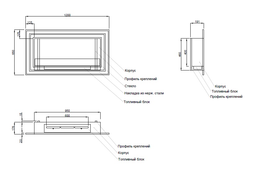 - Габаритные размеры ШxГxВ, (мм): 1200x191x650