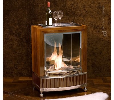 Фронтальная часть биокамина имеет изящный бортик. Верх модели венчает блестящий металлический поднос для фруктов, вин и сигар. Модель на колесиках, поэтому перекатить биокамин в другую часть помещения не составит труда.