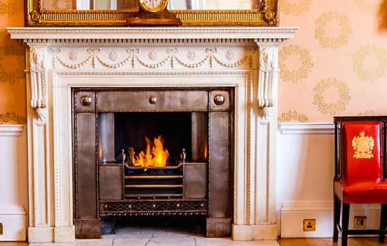 Встроенный в стену орнаментальный очаг имитирует кованое железо.