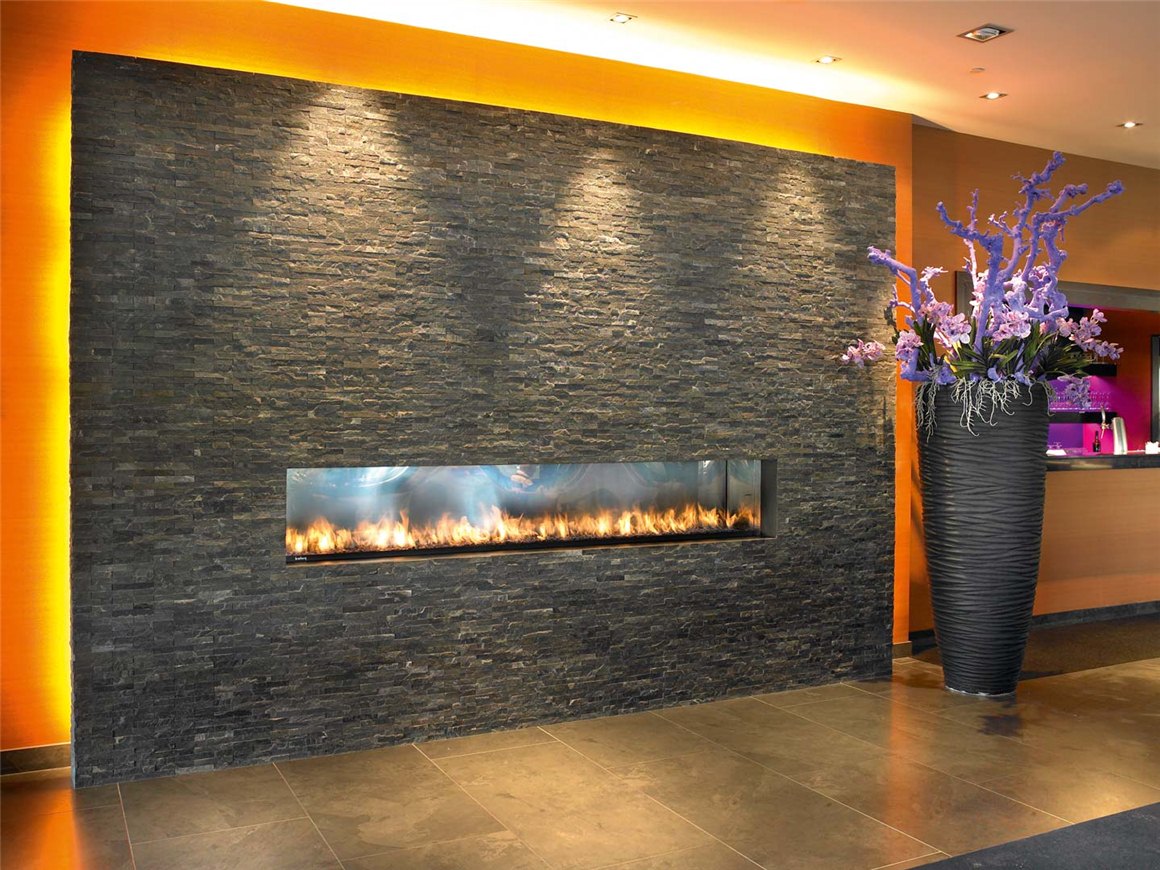 • Отличается большими формами – очаг удлиненной конструкции спрятан в стене. Его горизонтальная вытянутая форма по всей его длине представляет потрясающие по красоте язычки пламени, которые сверкают по одному вашему желанию.