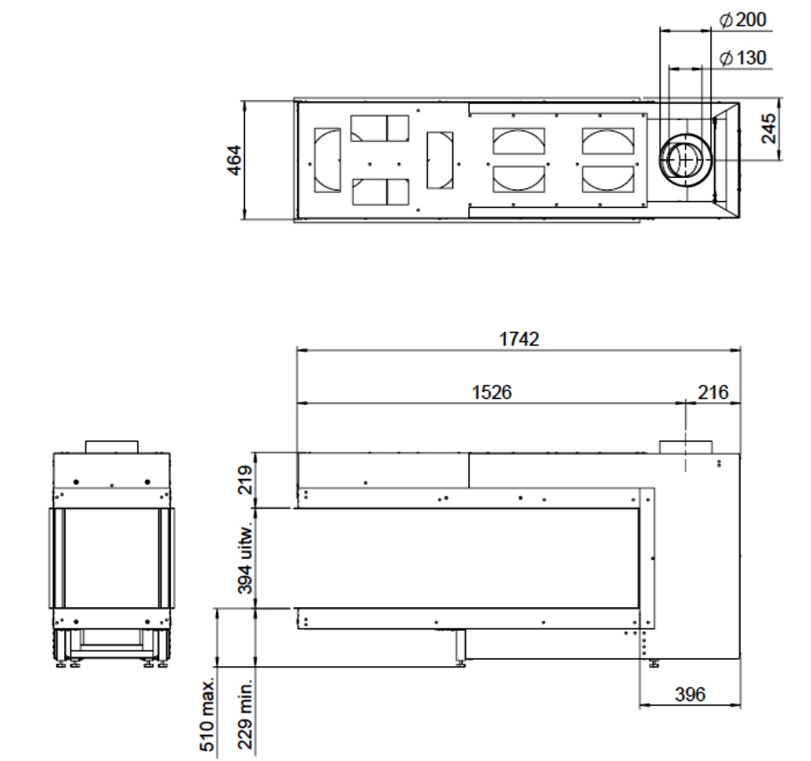 В камине реализована технология закрытого горения, при которой кислород в помещении не выжигается. Достигается это за счет абсолютной герметичности камеры и использования дымохода особой конструкции, имеющего двойной контур. По внешнему контуру воздух подается в топку с улицы, а по внутреннему – из топки удаляются продукты сгорания. Причем осуществляется все это за счет естественной тяги.