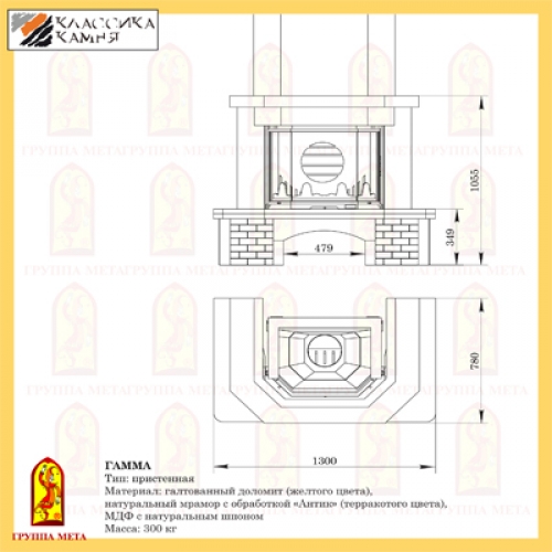 Материал: галтованный доломит (желтого цвета), натуральный мрамор с обработкой «Антик» (терракотового  цвета),  МДФ шпон дуба, окрашена.