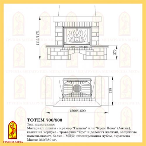 Материал: плиты - мрамор "Галала" или "Крема Нова" (Антик), камни на корпусе - травертин "Оро" и доломит желтый, защитные панели-шамот, балка - МДФ, шпонированна дубом, окрашена