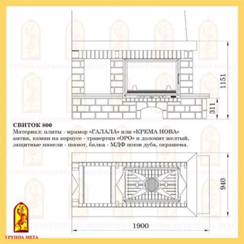 Материал: плиты - мрамор "ГАЛАЛА" или "КРЕМА НОВА" (Антик), камни на корпусе - травертин "ОРО" и доломит желтый, защитные панели-шамот, балка - МДФ шпон дуба, окрашена.