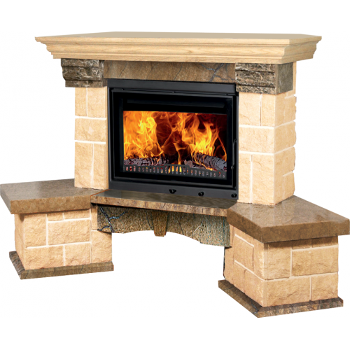 Строгие выдержанные линии камина Bella Italia Elizaveta, выполненного в светлых, пастельных тонах, прекрасно гармонируют с любыми интерьерными стилями. Широкий подиум облицовки и вертикальные боковины изготовлены из колотого мрамора Sunny Yellow желтоватого оттенка, так эффектно сочетающегося с золотистой игрой живого пламени. Горизонтальные «прослойки» и декоративные вставки изготовлены из полированного камня Rainforest Brown темных, коричневых тонов с естественными витиеватыми прожилками. В качестве обязательных элементов кантри направления присутствуют верхняя балка из светлого дуба и эффектно декорированная дровяная арка.