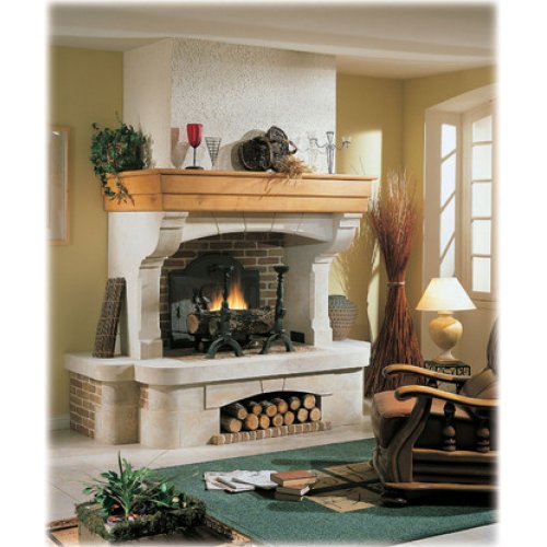 Пристенный камин изящной формы украсит любой загородный дом. Облицовка выполнена из золотистого бургундского камня и огнеупорного кирпича ручной работы песочного цвета. Массивная балка изготовлена из дуба.