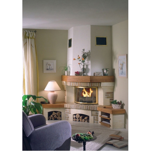 Угловой камин из камня Bretignac и огнеупорного кирпича ручной работы шириной 5 см песочного цвета. Данная модель имеет две боковые скамьи из дуба. Декоративная балка изготовлена из массива дуба, полки облицованы дубом.