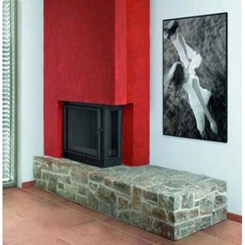 Угловой камин из камня Monte со швом. Чугунная топка модели Premier Convector открытая сбоку.