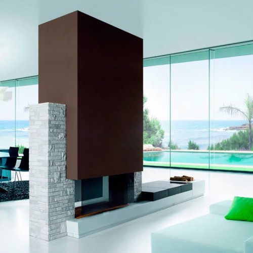 Центральный двухсторонний камин, матовый белый мрамор Yugoslavo Blanco и полированный черный Negro. Две боковые колонны - кладка лозете из мрамора грубой обработки Blanco Macael. Кирпичная топка с двойным стеклом. Система Swing Vitra Up&Down.