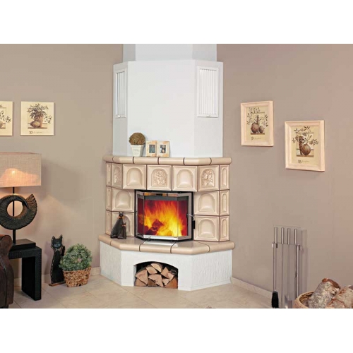 Угловой камин Hark 3/17.6 из изразцов. В комплект облицовки входят опорная рамка с крепежами, лента, клей, DVD с инструкцией по установке, бетонный цоколь  (если предусмотрен), и шамотный короб с проматом (если короб конструкционно входит в облицовку). В комплект не входят дымоотводные трубы, промат для изоляции стен, гофра для подвода воздуха под облицовку. Решётки поставляются опционно.