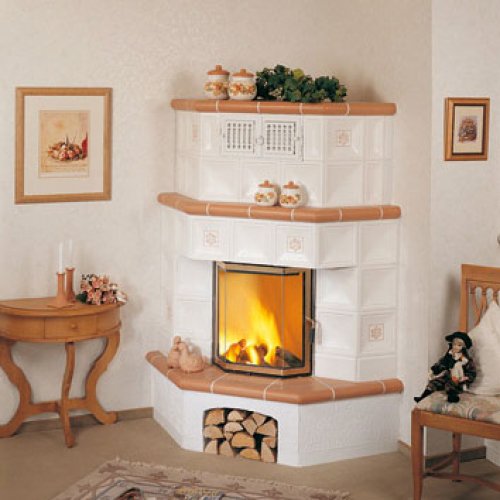 Угловой камин Hark 3/34.2 из изразцов. В комплект облицовки входят опорная рамка с крепежами, лента, клей, DVD с инструкцией по установке, бетонный цоколь  (если предусмотрен), и шамотный короб с проматом (если короб конструкционно входит в облицовку). В комплект не входят дымоотводные трубы, промат для изоляции стен, гофра для подвода воздуха под облицовку. Решётки поставляются опционно.
