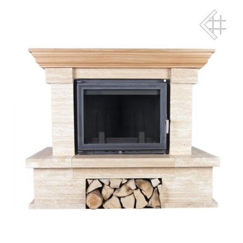 Облицовка для каминных топок класса Amelia/Felix. Пластины и верхняя панель выполнена у нее из полированного камня Trawertyn Classico. Стороны комплекта и база матовые. Фрезерованная дубовая балка.