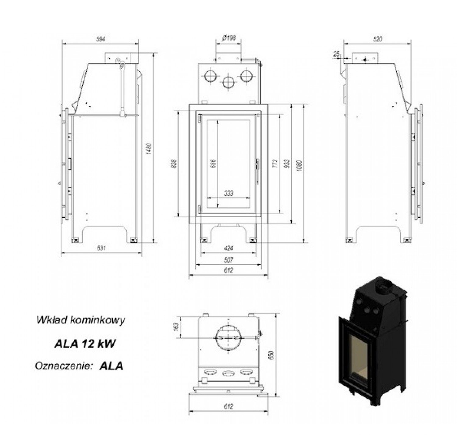 Ala— стальная топка вертикального типа отпроизводителя каминной продукции KRATKI. Топки вертикального типа— вариант топки для небольших помещений; они также могут использоваться вслучае ограниченного пространства для встроенного камина. Топка Ala имеет небольшую ширину— всего 612 мм. При небольшой производительности топка серии Ala имеет неплохой КПД, равный 75%. Такой КПД достигается благодаря сочетанию нескольких факторов— использования вермикулита, которым выложена камера сгорания, наличием высокого дымосборника иподводом воздуха для горения непосредственно в камеру. Преимущества модели топки Ala: Корпус топки изготовлен из котельной стали толщиной 4 мм; Материал камеры сгорания— вермикулит; Топливо— древесина (поленья не более 350 мм), уголь; Высокий дымосборник; Жаропрочное стекло, выдерживающее высокую температуру; Система, предотвращающая быстрое загрязнение стекла— «чистое стекло»; Держатель для дров; Подвод воздуха для горения; Регулируемые ножки; Вермикулитовый дефлектор, встроенный шибер.