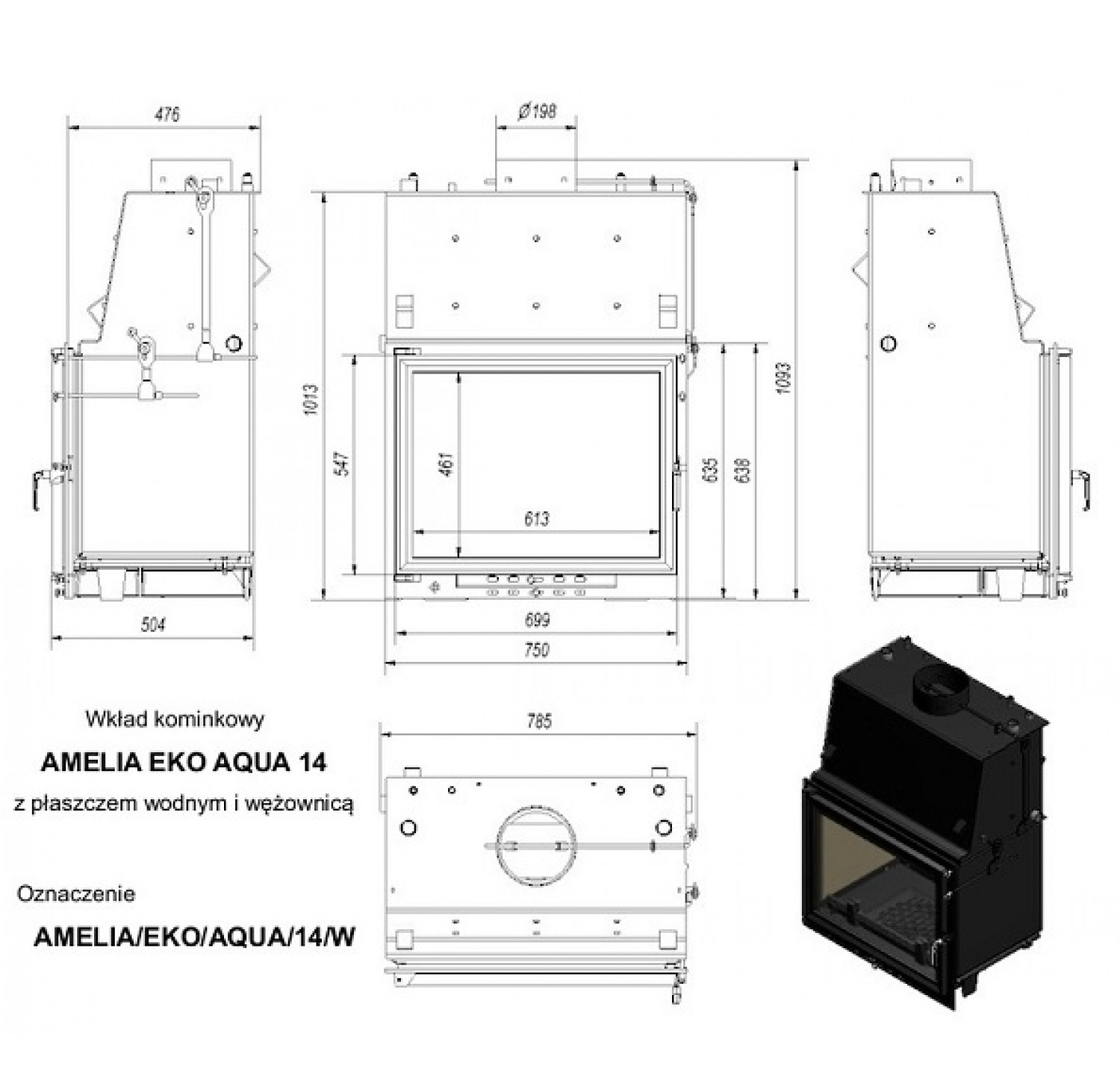Amelia EKO/AQUA/14/W (змеевик)— топочная камера или топка-вкладыш, предназначена для отопления дома площадью до140 кв.м. Серия топок EKO AQUA отKRATKI- топки небольшой производительности, новысокой эффективности. Благодаря наличию футеровки камеры сгорания исистемы дожига выхлопных газов топка Amelia EKO/AQUA/14/W имеет КПД более 80%, инизкий показатель выброса вредных веществ. Преимущества топок серии Amelia EKO/AQUA/14/W отKratki: Топка закрытого типа снепрерывным горением ивстроенным водяным теплообменником мощностью 14 кВт иобъемом 58 л; Линия топок серии EKO AQUA имеет награду «Лидер новых технологий 2012» Футеровка камеры сгорания материалом Acumotte; Система дожига выхлопных газов— способствует уменьшению вредных выбросов ватмосферу; Медный змеевик— защита топки отперегрева инагревание воды набытовые нужды; Высокий дымосборник, присоединение дымоход сверху; Топливо— твердая древесина, коричневый уголь; Рама топки истанина изготовлены изтермоупорного чугуна; Топка с водяным теплообменником изготавливается изнелегированной листовой стали специальных сортов; в камере сгорания расположены дымоградные трубы увеличивающие поверхность теплообмена втопке; Термостойкое стекло Robax (порог температурной устойчивости 800 С); Система чистого стекла предотвращает быстрое загрязнение; Встроенный шибер, дефлектор извермикулита; Система холодной ручки; Управлением потоками первичного ивторичного воздуха для горения; Решетка надне камеры сгорания, ящик для сбора пепла; Накорпусе топки предусмотрены специальные ручки, предназначенные для удобства транспортировки; Держатель для дров, предотвращает рассыпание дров при открытии топки.