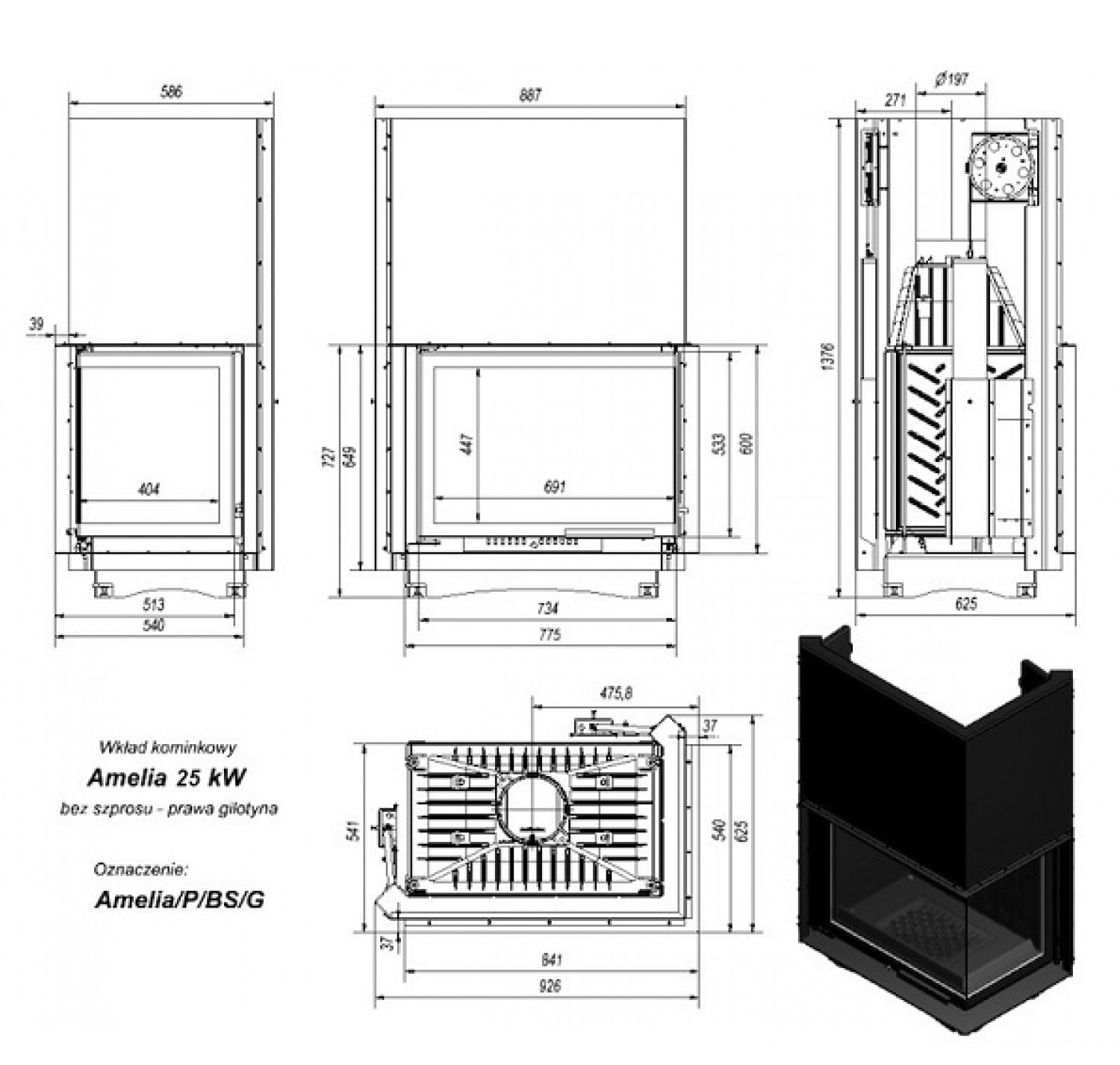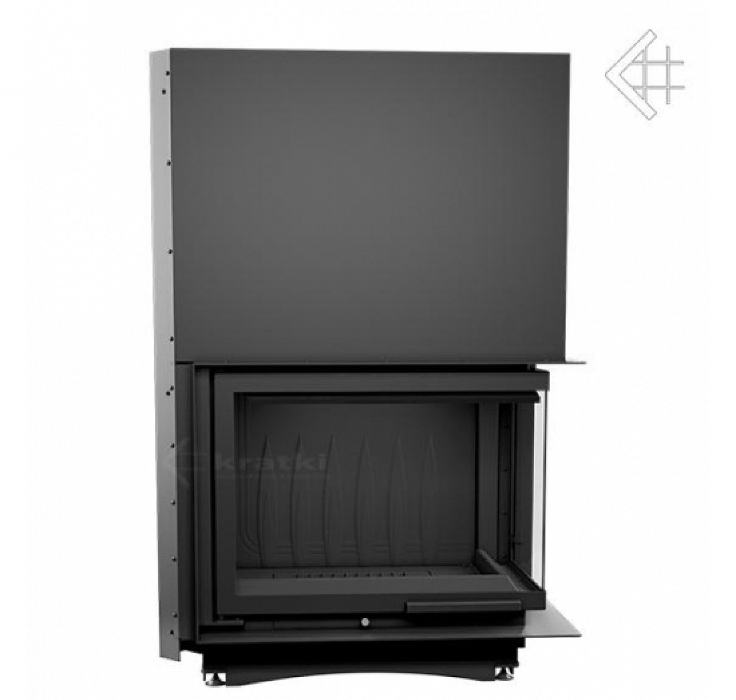 Amelia P/BS/G (угловое стекло справа, гильотина)— топочная камера или топка-вкладыш, предназначенная для отопления дома площадью до250 кв.м. Встраиваемая топка отKRATKI сгильотинным механизмом (вертикальный подъём дверцы). Чугунная топка-инсерт, работающая надревесном топливе свысоким дымосборником ибольшой камерой сгорания имеет угловое стекло, позволяющее любоваться живым пламенем снескольких сторон. Вслучае полного открытия дверцы (которая скрывается вподъемном механизме) топка Amelia P/BS/G «превращается» воткрытый камин. Особенности оборудования серии Amelia Р/BS/G отKRATKI: Дверца сГ-образным стеклом слевой стороны; Вертикальный механизм подъема дверцы; Чугунная топка непрерывного сгорания; Топка высокой мощности, предназначена для больших помещений; Теплоемкость прибора увеличивают ребра повсему корпусу; Топливо— сухие дрова длиной до500 мм; Стекло— термостойкая стеклокерамика, предел нагрева 800 С; Полная герметичность дверцы; Система «двойного дожига»; Топка имеет съемную ручку надверце; Прозрачность стекла обеспечивает система встроенного обдува; Предусмотрен держатель дров— непозволяет рассыпаться при открытии дверцы; Дно топочной камеры имеет отверстие для золы.