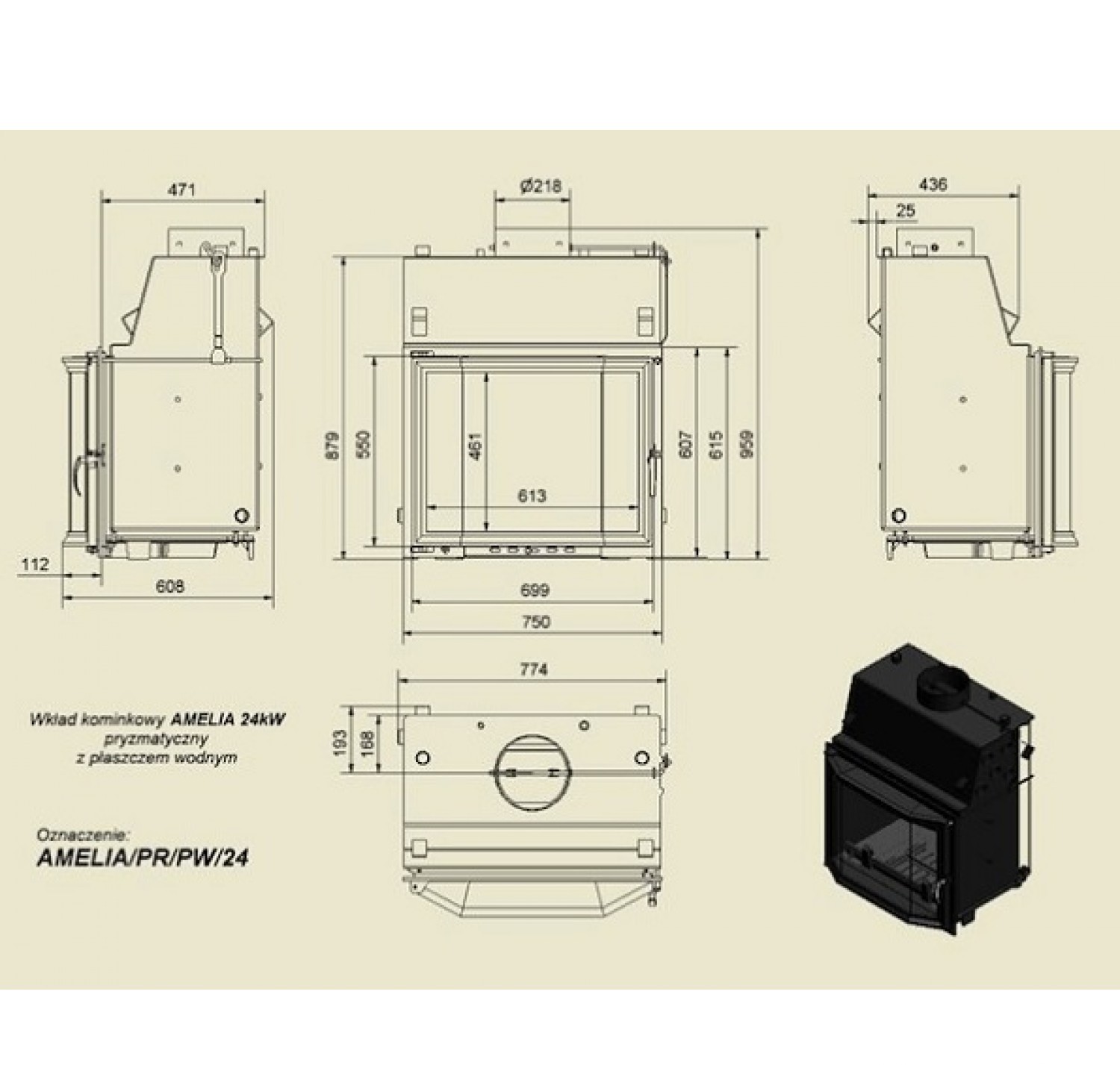 Каминная топка Amelia/R/PW/24 с водяной рубашкой