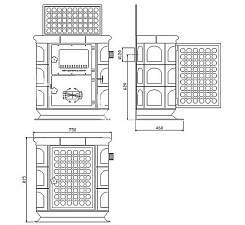 Топка оснащена регулятором тяги, который автоматически открывается в момент поднятия дверцы. Съемные и поворачивающиеся задвижки, через которые поступает воздух. Выдвижной зольник. Съемные ножки.