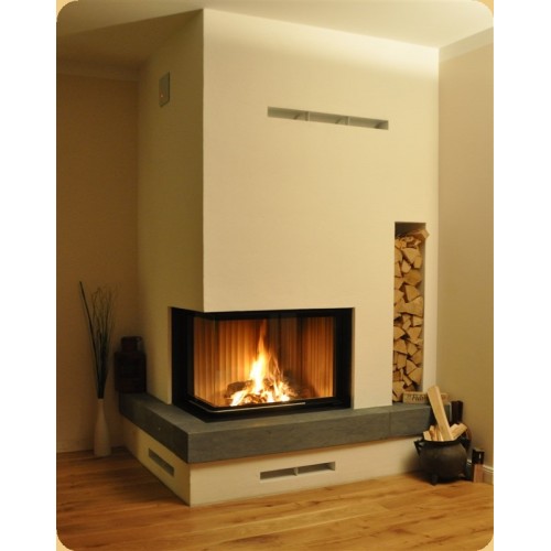 Угловая каминная топка с цельным Г-образным стеклом. Боковое стекло слева. Дверца с подъемным механизмом (система Easy-Lift). Топочная камера футерована шамотом. Ширина дверки 657/427 мм, высота - 545 мм. Возможно подключение воздуха из-вне.