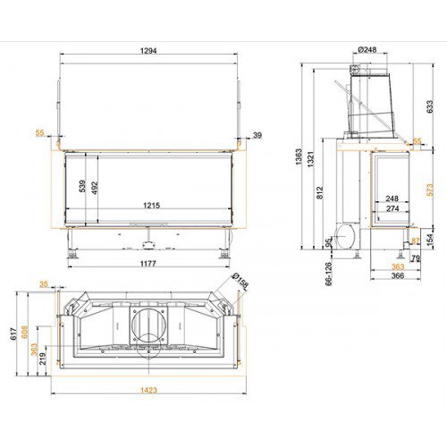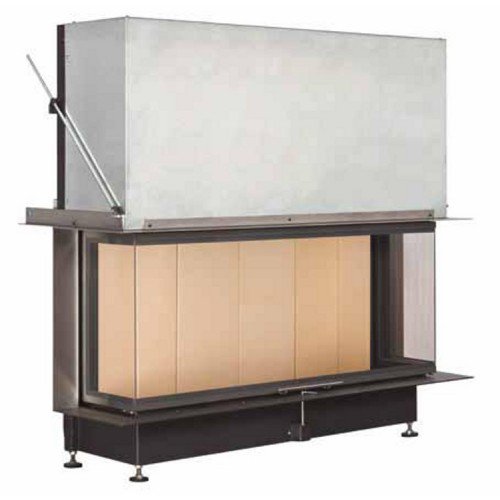 Трёхсторонняя каминная топка. Топочная камера футерована шамотом. Подъёмный механизм двери (система Easy-Lift). Ширина дверки 248/1215/248 мм, высота - 479 мм. Возможно подключение воздуха из-вне.