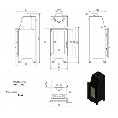 Ala – стальная топка вертикального типа от производителя каминной продукции KRATKI. Топки вертикального типа – вариант топки для небольших помещений; они также могут использоваться  в случае ограниченного пространства для встроенного камина. Топка Ala имеет небольшую ширину – всего 612 мм. При небольшой производительности топка серии Ala имеет неплохой КПД, равный 75%. Такой КПД достигается благодаря сочетанию нескольких факторов – использования вермикулита, которым выложена камера сгорания, наличием высокого дымосборника и подводом воздуха для горения непосредственно в камеру.