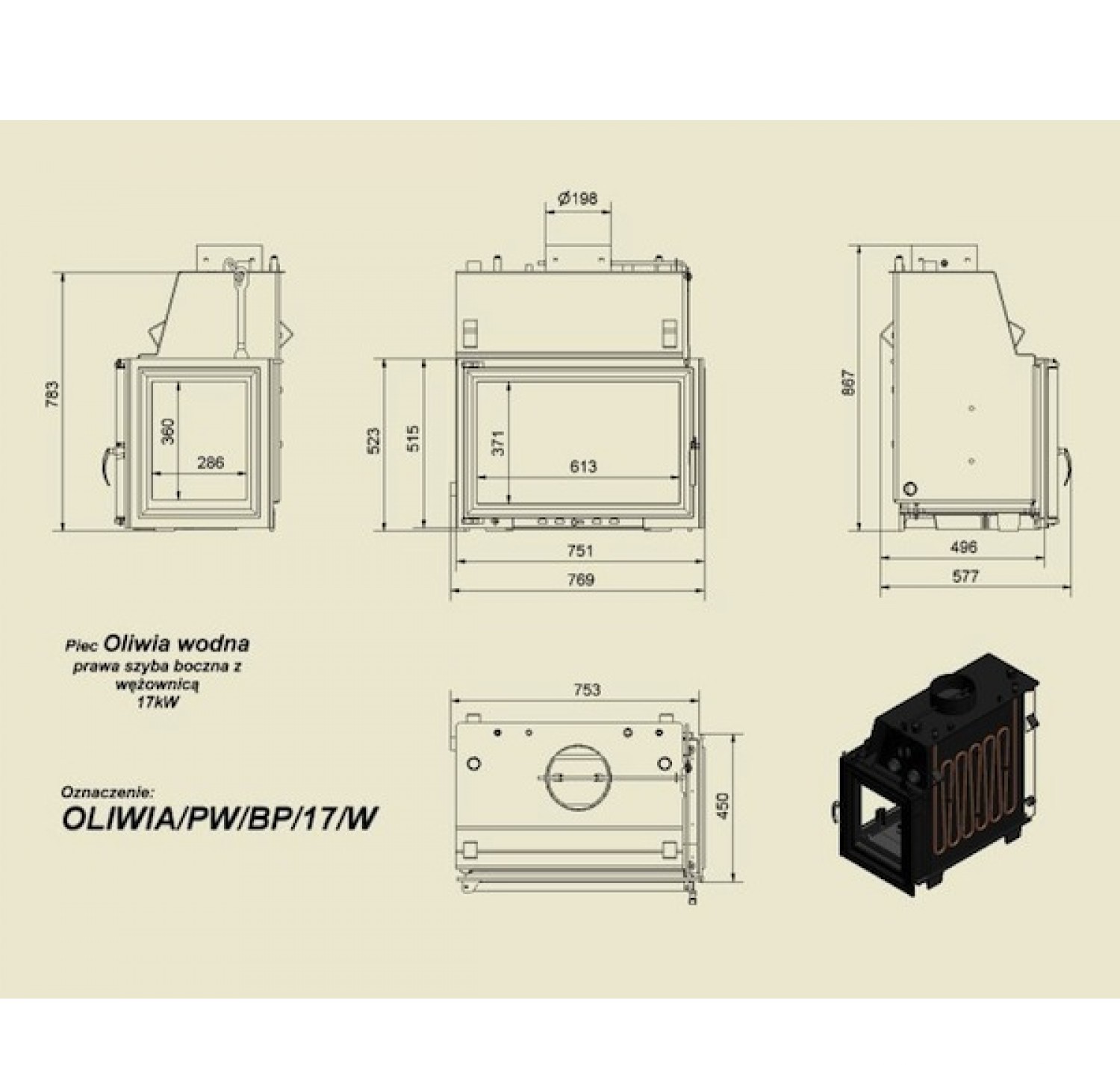 Каминная топка Oliwia/PW/BP/17/W/Z с водяной рубашкой (стекло справа)