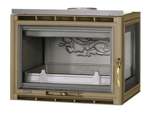 Чугунная топка для каминной облицовки. Прямая дверца с бронзовой рамкой. Огнепрочное стекло, выдерживающее высокую температуру. Дверца открывается в сторону. Система очистки стекла.