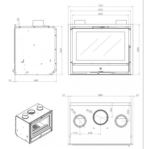 Дровяная кассета с корпусом из температуроустойчивой стали. Широкая дверь с большим окном из стеклокерамики, которое выдерживает температуру до +750 градусов. Внутренняя отделка выполнена из вермикулита. Представленная модель оборудована выдвижным зольным ящиком, что упрощает уход за топкой.
