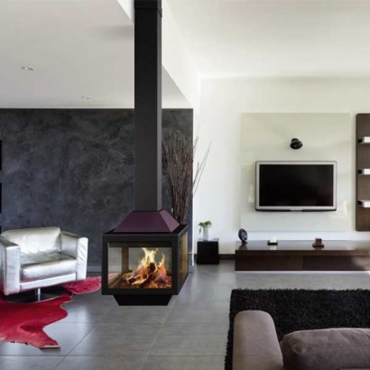 Центральный подвесной камин со стеклом и двойным верхним кожухом. Цвет - серый, кожух - RAL 5023.