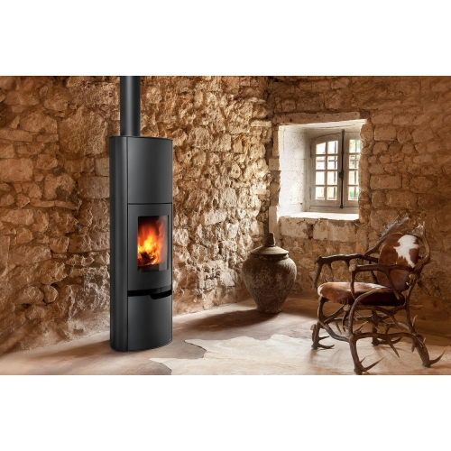 Современная стальная печь с полукруглой стеклянной дверцей. Жаростойкое стекло открывает красивый вид огня. Внутренние стенки топки выложены огнеупорным материалом. Экономичный расход топлива, система самоочитски стекла. Система двойного дожига.
