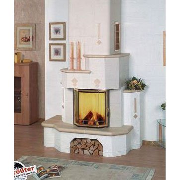 Пристенный камин из изразцов белого цвета, каминные полки и столешница цвета sahara.