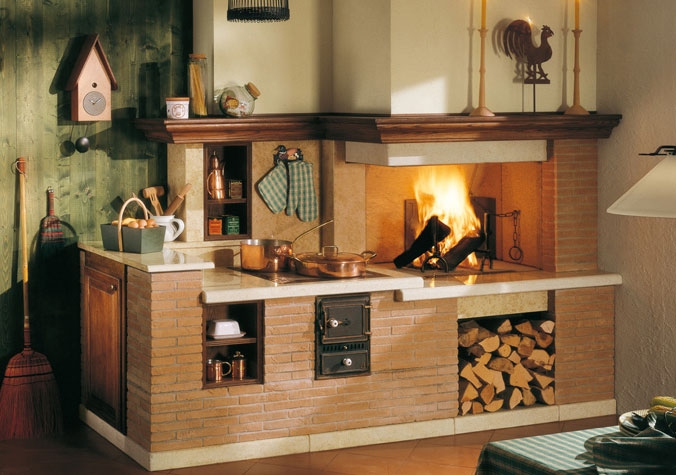 Пристенно-угловой камин из кирпичей, обработанных вручную. Столешница из полированного мрамора Giallo dIstria. Дровяная печь из стали и чугуна. Левое исполнение.