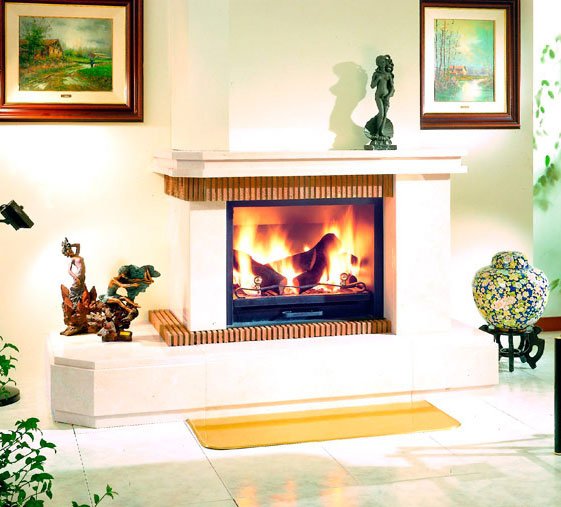 Фронтальный камин из полированного Crema Marfil. Плита и консоль из огнеупорного кирпича толщиной 1,5 см. Асимметрично удлиненная плита. Металлическая топка 904 с колосником и зольником.