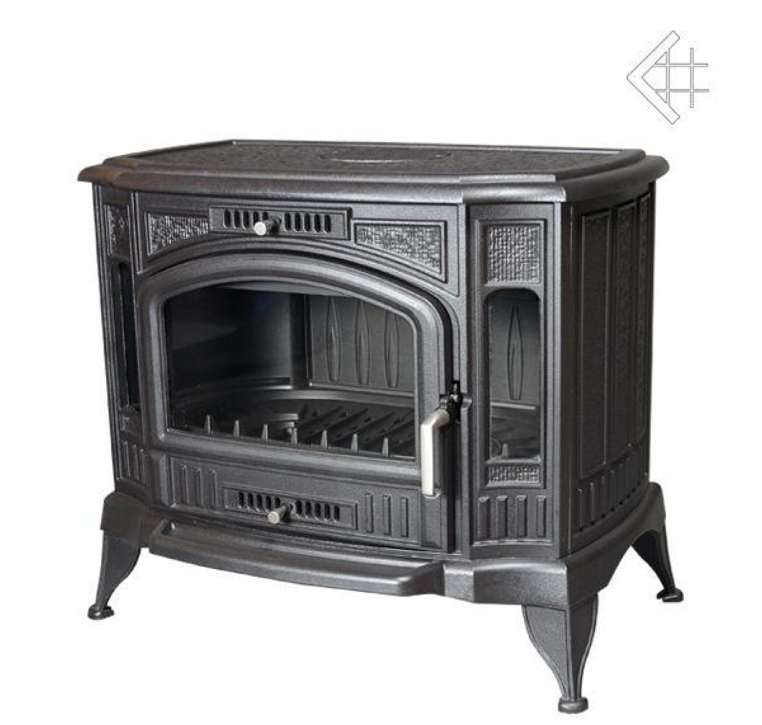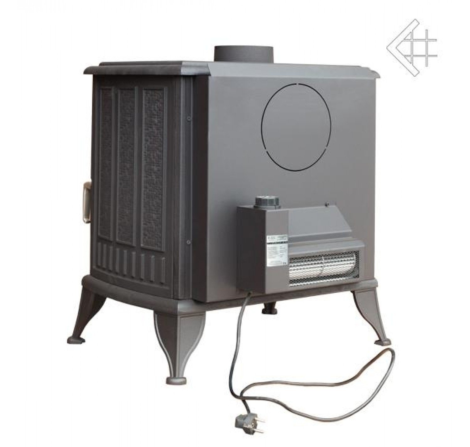 Чугунная печь польской компании «Kratki.pl» выделяется из модельного ряда высокой мощностью (до 14кВт), дизайном в классическом стиле и строгими формами. Эта печь оснащена турбиной принудительной конвекции нагретого воздуха от печи в помещение. Наличие турбины в несколько раз повышает скорость прогрева помещения. Горячий воздух не «застаивается» около отопительного прибора, а сразу начинает поступать в непрогретые участки, благодаря постоянному воздушному потоку. Турбина потребляет небольшое количество электроэнергии, а эффективность работы печи в момент первоначального прогрева помещения повышается многократно. Присоединение дымохода возможно как сверху, так и сзади.