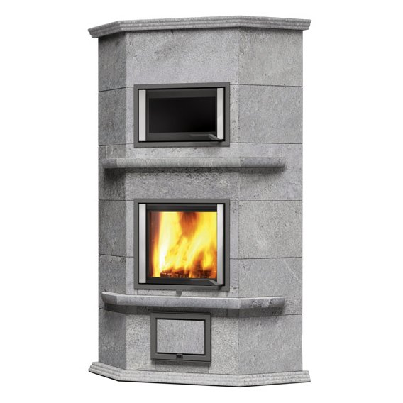 Угловой печь-камин с задним нижним подключением 2 теплового класса, для больших помещений.