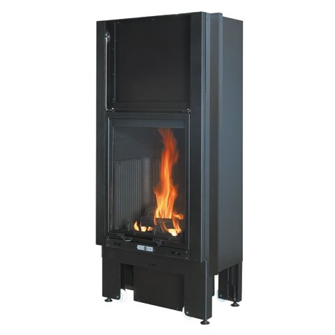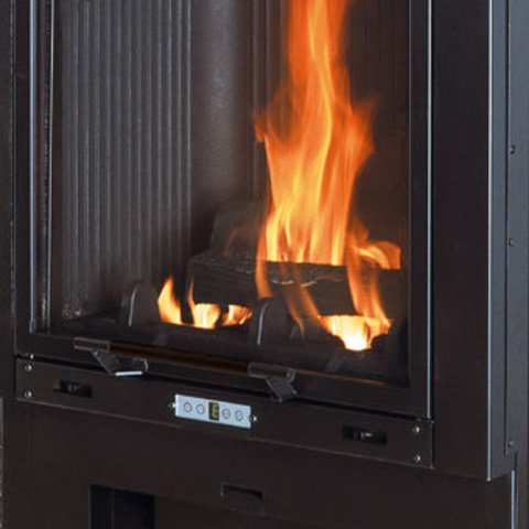 Предусмотрены 4 отверстия в кожухе топки для подключения к системе разводки горячего воздуха. Топка укомплектована системой двойного дожига.