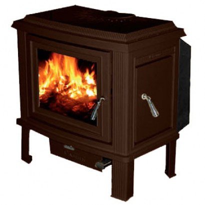 Печь с фронтальной и боковой дверцами, имеет систему Чистое стекло, ручка дверцы не нагревается в процессе топки. Печь покрыта эмалью, цвет - коричневый.