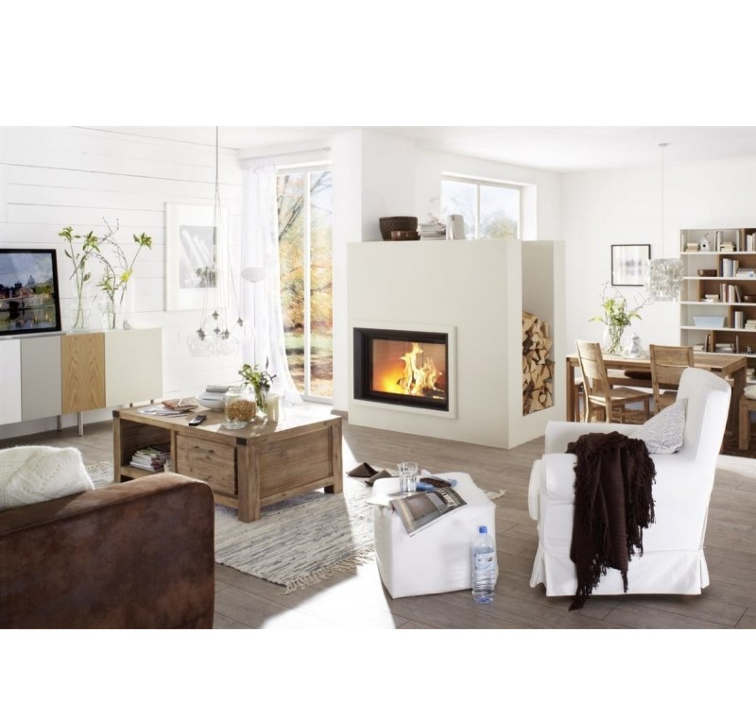 Каминная топка с прямым стеклом. Топочная камера футерована шамотом. Подъёмный механизм двери (система Easy-Lift). Ширина дверки 851 мм. Высота дверки 502 мм. Возможно подключение воздуха извне.