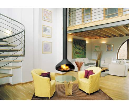 Эта модель обладает простой эргономичной формой средних размеров с высокими возможностями теплоотдачи, что делает ее одной из самых востребованных подвесных моделей с открытой топкой. Дымоход и пластина для крепежа изготавливаются по размерам заказчика.