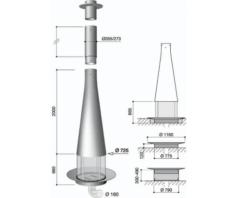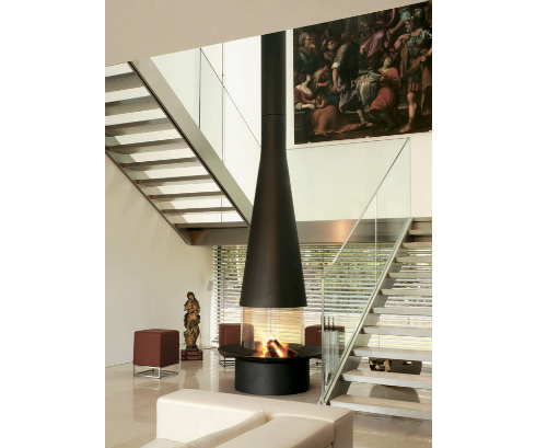 Основание очага может располагаться на двух разных высотах по отношению к полу, а также может быть приподнято на специальной стальной подставке (дополнительная опция). Застекленные дверцы выполняют функцию искрогасителей.