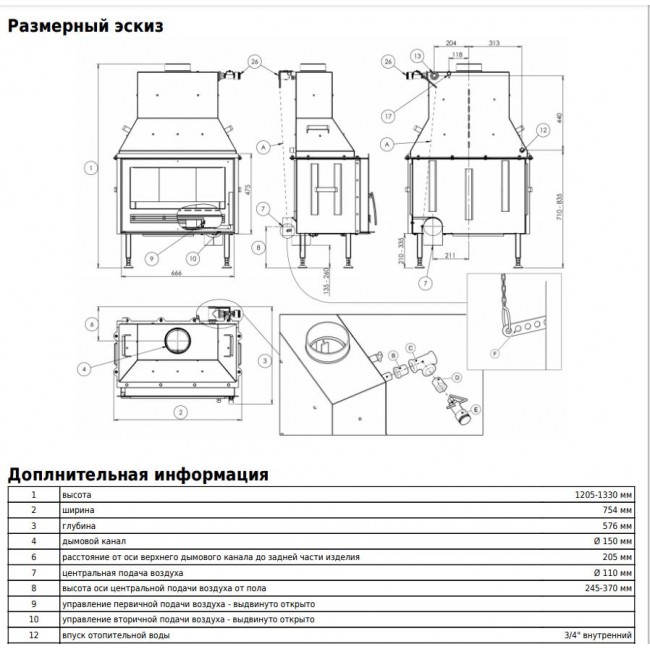 - Диаметр дымохода, (мм) 150