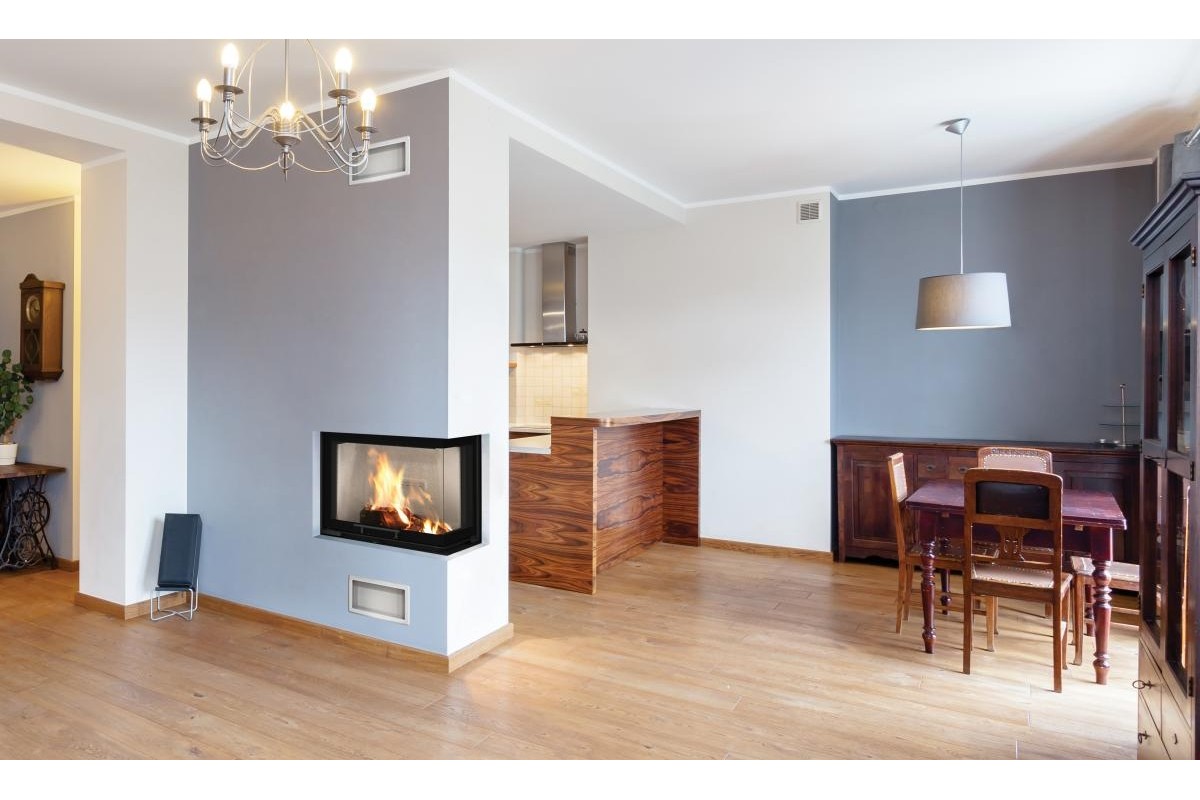 Угловая каминная топка BeF Therm V 8 CL с Г-образной формой дверцы и подъемом – это европейская современная модель предназначенная для работы на сухих дровах лиственных пород дерева или брикетах.