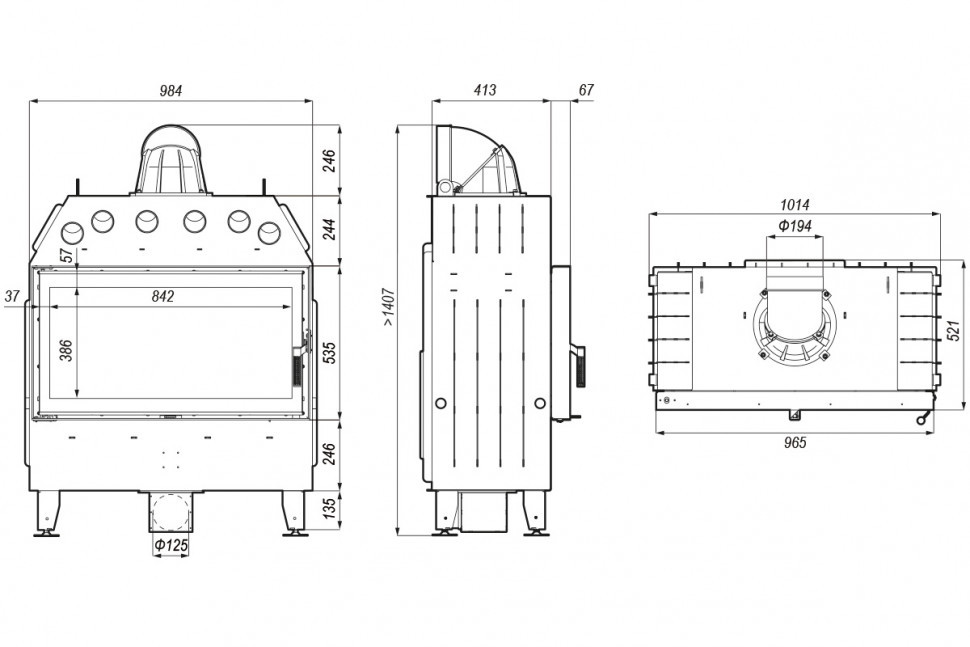 Изготовлена из стали с порошковым покрытием и имеет эффективность нагрева 80,1%. Устройство с центральной подачей воздуха снаружи и возможностью ее регулировки. Специальная конструкция на трубе для подачи воздуха в топку, дает возможность изменить направление подачи воздуха на боковое. Плотно размещенные радиаторы способствуют передачи больше тепла окружающей среде, а воздуховоды повышают эффективность камина. Модель оборудована жаростойким стеклом, что выдерживает температуру до 800 °С.