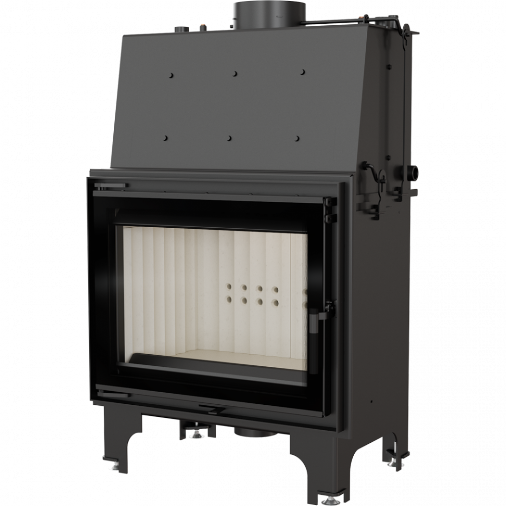 - Система аэрации камеры сгорания, реализована исключительно извне через доставку первичного и вторичного воздуха в камеру сгорания. Стандартно топка имеет подвод воздуха диаметром ø 125 мм, который дает возможность подать свежий воздух в камеру сгорания снаружи здания. Разделение воздуха проходит в пространстве ниже нижней плиты камеры сгорания. Воздух поступает каналом, который находится на высоте нижней плиты к забору, оборудованному вдоль всей длины системой отверстий. Это приводит к улучшениям условий сгорания шихты. Сгорание происходит равномерно по всей ширине камеры сгорания. Регулировка интенсивности сгорания в топке происходит с помощью механизма, который находится ниже дверец топки.