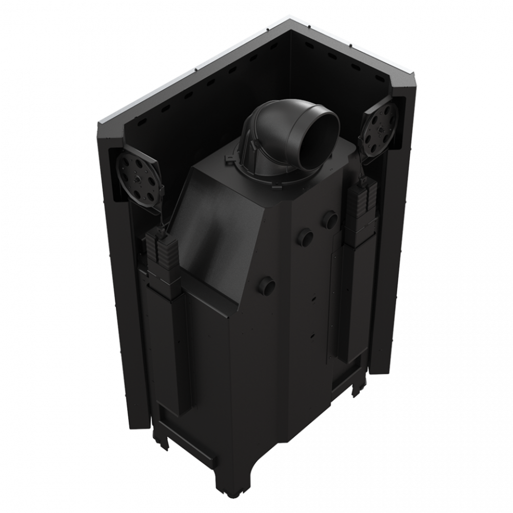 - Высокий переход из камина в дымоход и размещены поперек водяные дефлекторы увеличивают поверхность теплообмена между топкой и окружающей средой. Понижение температуры дымовых газов приводит к увеличению мощности устройства.