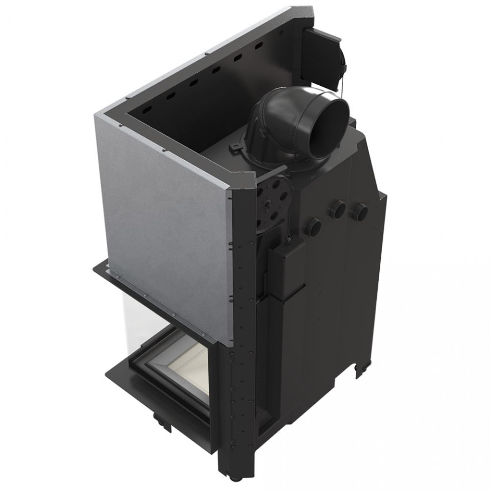 - Высокий переход из камина в дымоход и размещены поперек водяные дефлекторы увеличивают поверхность теплообмена между топкой и окружающей средой. Понижение температуры дымовых газов приводит к увеличению мощности устройства.