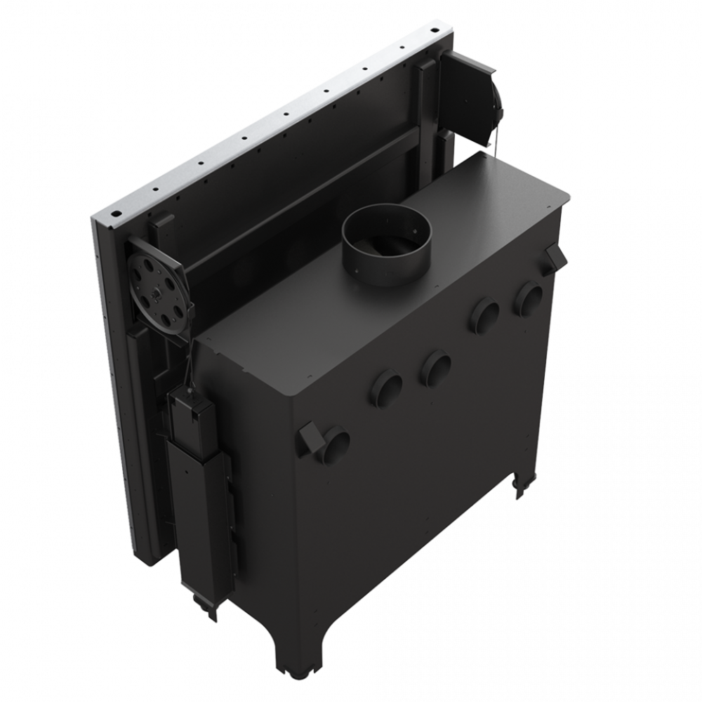 - Дверцы топки работают в системе lift up - стеклянная панель поднимается вверх. Эта система была построена, опираясь в противовес - два блока (по обоим сторонам двери) со стальной рейкой работают в направляющих на двух несущих роликах, благодаря чему вес двери равномерно распределяется. Они движутся вдоль на огнеупорных роликах, установленных в дверной раме, что гарантирует их лёгкое, тихое и бесперебойное функционирование. Движение дверец происходит на расстоянии пару миллиметров от корпуса, что предотвращает повреждение герметизации. Дверцы, которые закрываются, с большой силой погружаются в дверную раму, благодаря чему камера сгорания есть полностью герметичной.